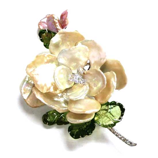 The pearl brooch features a graceful style. It boasts a flower with petals made of shiny pearl. The centerpiece features stunning diamonds. The clear leaves in peridot add a natural dash to the brooch. It makes a graceful accessory.