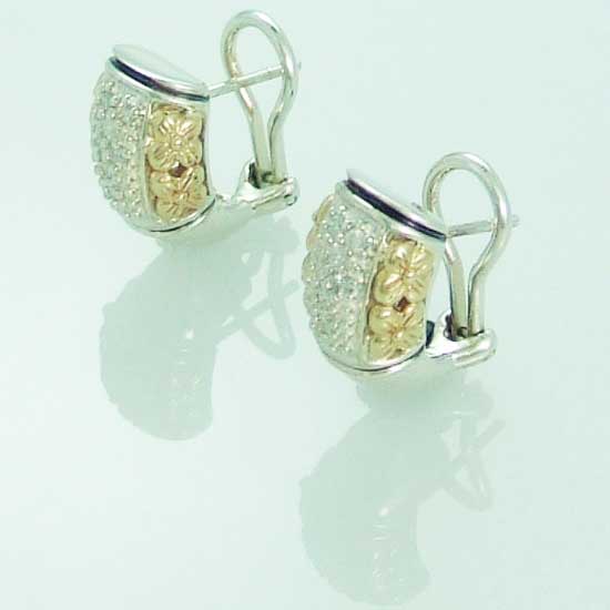 Displayed is a pair of ladies' earclips in gleaming silver construction. The yellow-gold accents and diamond floral motif offer added elegance and allure. Sparkle and shimmer with this delicate pair on your ears.