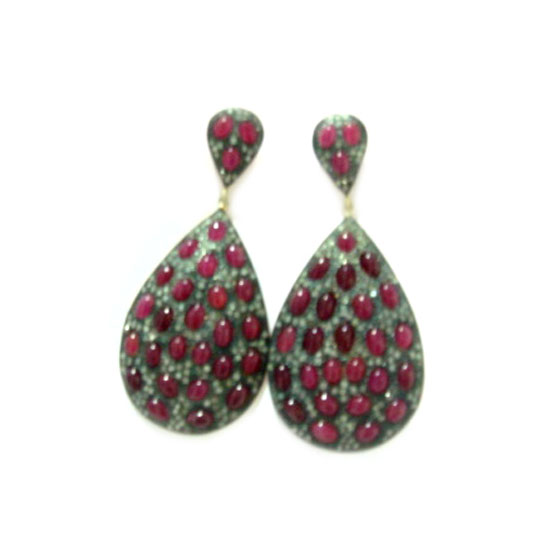 Displayed is a pair of diamond earrings that is accented with ruby. Featuring a pear shape, these diamond earrings dangle freely for a brilliant shine. These gorgeous diamond earrings are finely crafted for superior quality.