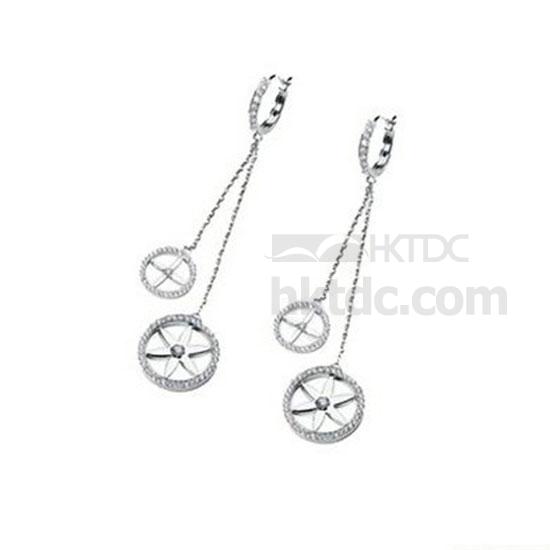 This is a pair of diamond earrings mounted on 18K gold. Featuring long dangles in a wheel shape, these earrings are fashionable and dynamic. These stylish earrings are great for daily wear.