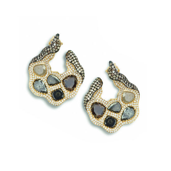 This pair of diamond earrings hangs gorgeously from your earlobes. The white and brown micro-pave diamonds and the different shapes of icy diamonds are delicately fixed on the 18K yellow gold. You can appreciate its superior craftsmanship and incredible shimmer in great wonder.