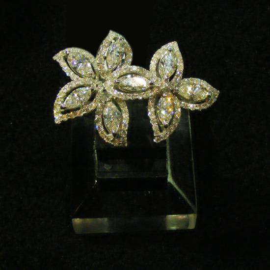 This pair of earrings features flower patterns made of diamonds. Each petal consists of a marquise-shaped diamond, surrounded by another marquise-shaped piece, which is beaded elegantly. All pieces on the earrings are faceted, making them very sparkling under lights.