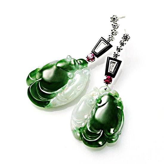 The pair of jadeite earrings boasts a carved jadeite pendant with delicate green and white hues. They are decorated with pink and white diamonds for a sparkling touch. Add a traditional touch to your look with these jadeite dangle earrings.