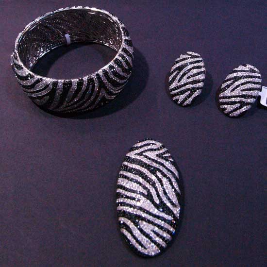 This is a diamond jewelry set including a pendant, a bangle and a pair of earrings. Each item is fully embellished with black and white diamonds, forming chic zebra patterns. This jewelry set surely will complement your fashion outfit with a touch of luxurious glamor.