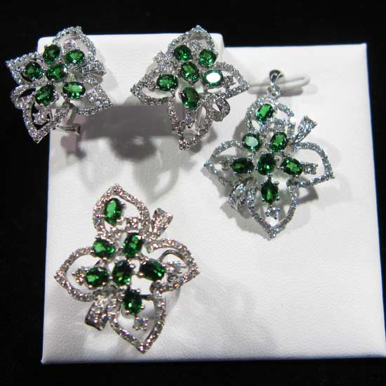 This diamond jewelry set comes with a pair of earrings, a ring and a pendant with a sophisticated and elegant design. The green gemstone decoration adds a touch of uniqueness to the entire set. This diamond jewelry set is a great gift to impress beloved ones.