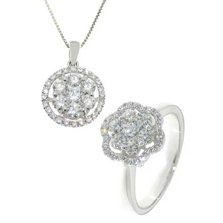 This diamond jewelry set comes with a ring and necklace. The unique floral shape is feminine and alluring to catch people’s attention immediately. This diamond jewelry set has a top-quality 18K white gold frame for added glamor.