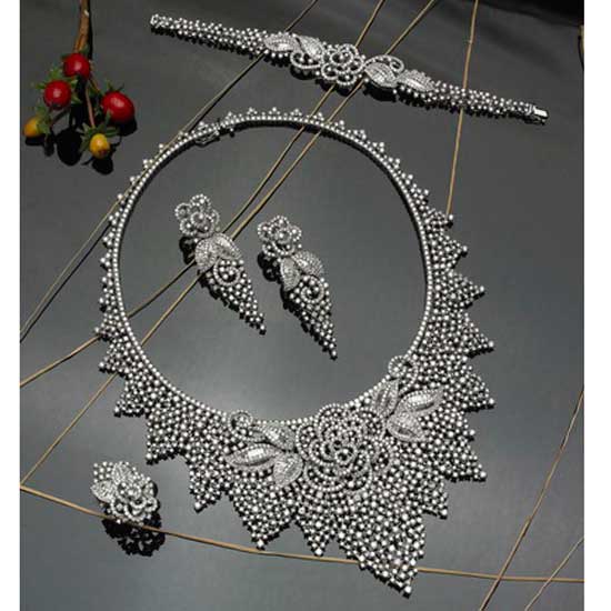 As shown is a set of ladies’ jewelry coming with a necklace, a ring and a pair of earrings. The design features an elegant flower theme, adorned with faceted diamonds. Loose diamonds are paved allover the settings to show irresistible glamour.