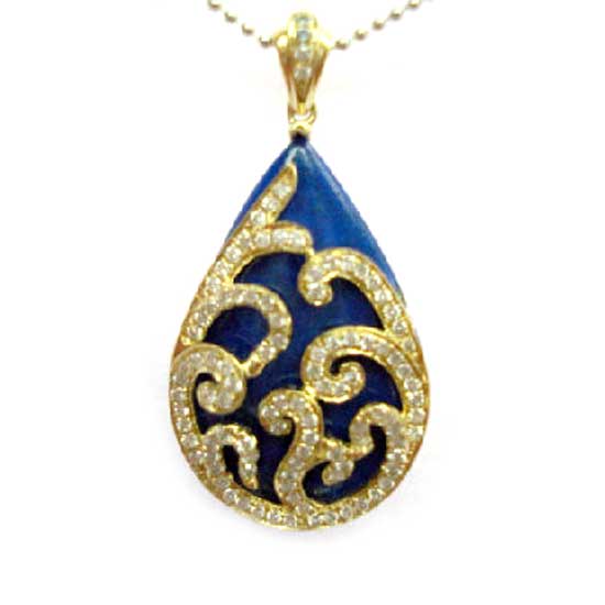 This alluring blue lapis pendant comes in a delicate teardrop shape with 18K gold sea wave motifs. It is adorned with dazzling diamonds for aristocratic grace. This ingenious diamond lapis pendant is sure to glam up your neck.