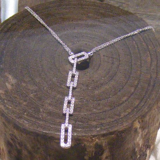 This is a single Y drop necklace. It is made of 18K white gold, nicely mounted with white diamond beads. It features an art-deco inspired rectangle drop pendant.
