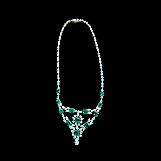 This necklace clutches ladies' heart with its trendy and stunning appearance. It consists of various sparkling diamonds in assorted shapes and green square emerald stones for added uniqueness. This stylish necklace goes well with any evening gown.
