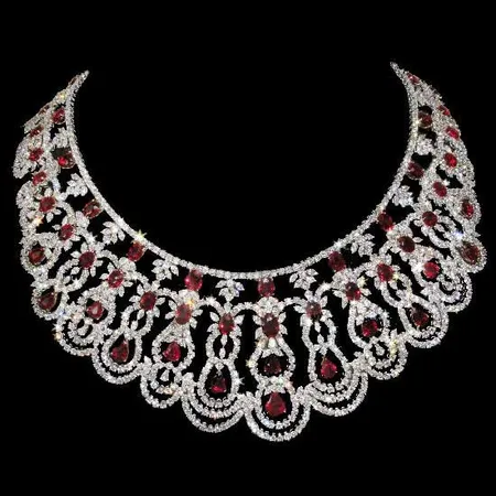 This en-esclavage necklace is crafted with diamonds of different fancy cuts. The diamonds are polished into pear, marquise and round shapes. The classy necklace dresses up your plain neckline in a noble style.