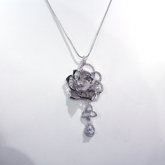 This silver necklace is crafted with dazzling diamonds for an elegant touch. It is designed in a flower shape for an eye-catching look. This well-designed diamond necklace will surely make you stand out from the crowd.