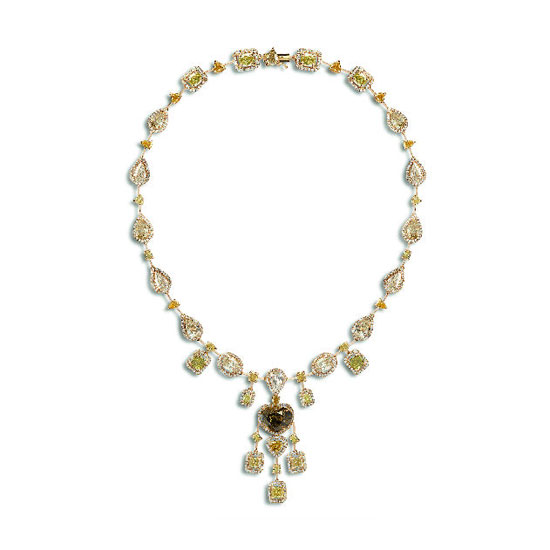 This brilliant necklace is finely crafted with a mixture of white, yellow, brown and pink diamonds in different shapes. The heart-shaped brown diamond at the center weighs 9 carats for a splendid look. This necklace is truly unmatched for its magnificence.