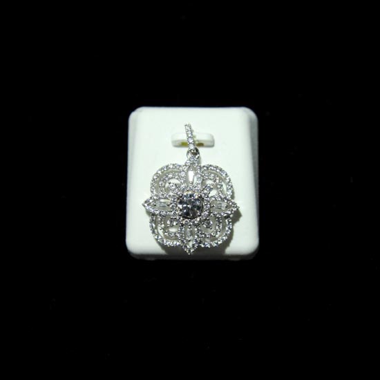 Showcased is a delicate pendant designed with unique cut-out patterns. A round-cut diamond is centered on a 4-prong base. The setting is set all over with loose diamonds to give out attractive sparkles.