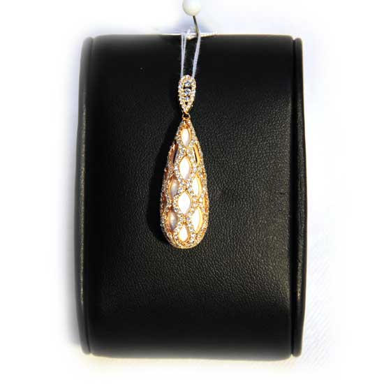 This pictured teardrop-shaped pendant is set with 18K rose gold and a white agate stone. It is adorned with white diamonds for added glamour. This 18K rose gold pendant goes great with assorted outfits.