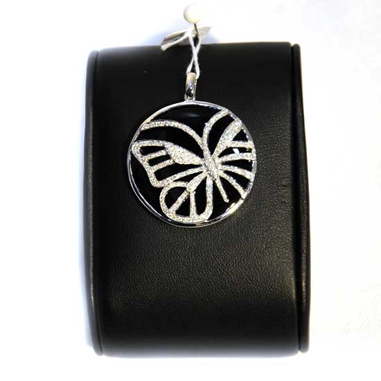 This splendid 18K black gold pendant is set with a polished black agate. It features a butterfly embellishment accented with well-cut diamonds for added glamour. This alluring diamond pendant will surely catch a lady’s eye.