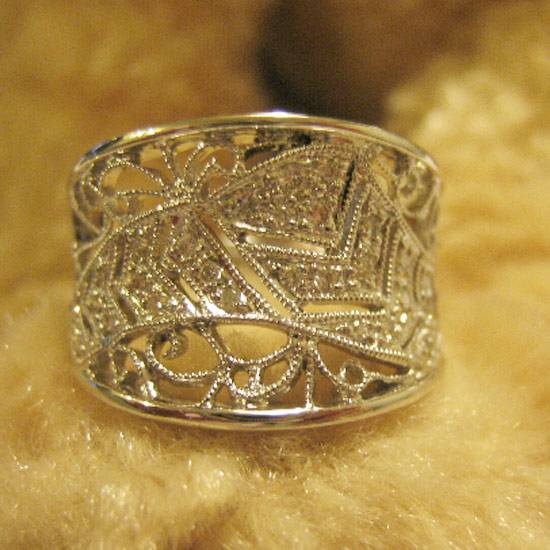 This is a diamond ring of antique design. The ring is decorated with 27 pieces of brilliant diamonds of a total of 0.14 carats.