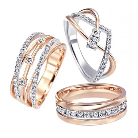 These are diamond rings set in a combination of 18k yellow and white gold. Designed with modern linear patterns set with small round cut white diamonds. The yellow gold is in matte style.