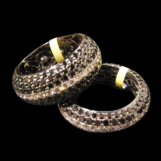 This is a diamond ring set in gold. It features rows of white and black round diamonds in pave setting. There are openwork patterns on the inner part of the ring.