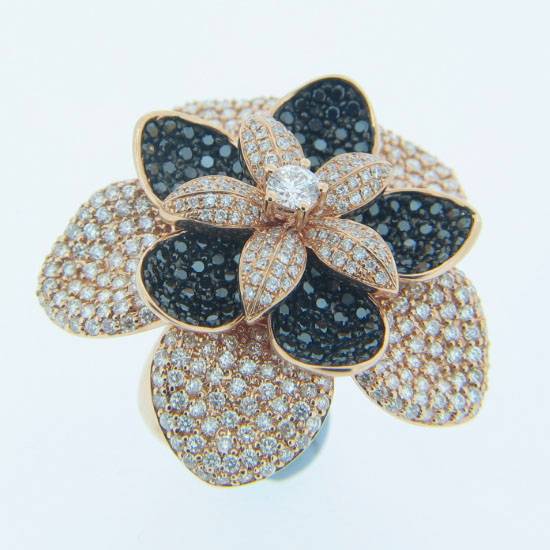The diamond ring flaunts an exquisite floral appearance. Set in gorgeous white gold, the contrast and symmetry of the black and white diamonds are simply breathtaking. This stunning diamond ring makes a sophisticated addition to your jewelry collection.