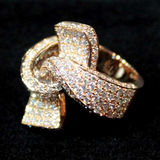 This diamond ring comes in a delicate and unique design. The high-quality 18K rose gold frame adds a feminine touch. The loose diamonds are carefully arranged for the glamorous appearance.