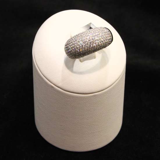 This stunning ring features a polished band of remarkable width, with half of the band embedded with glittering diamonds, dazzling with utmost radiance in all rotations. The glamorous design accentuates ladies' evening dresses.
