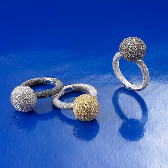 This diamond ring in the picture comes with a gold band to enhance attractiveness. The center ornament is covered with loose-cut diamonds for a more elegant figure. This diamond ring is best to wear with your evening outfits.