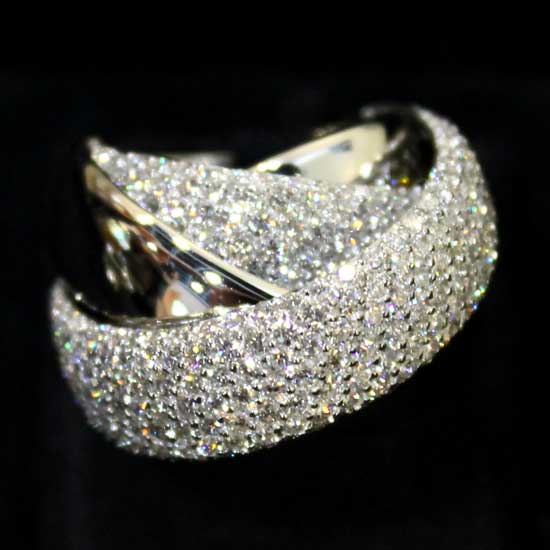 Presented is a ring with a tri-band design that symbolizes eternity. The ring is fully paved with gleaming icy diamonds for a dazzling style. The ring compliments any style with ease.