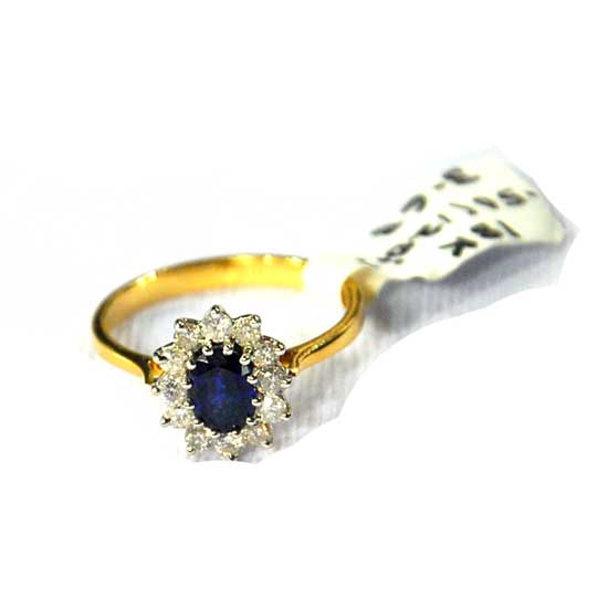 As shown is a delicate diamond boasting an elegant design. The ring features a shiny blue gem embraced by dazzling diamonds. The glittering golden setting exudes a classy style to please ladies.