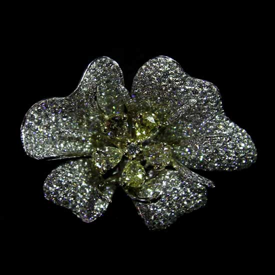 Featured is a ring with a floral design. The ring is finely encrusted with 387 pieces of white diamonds and 5 pieces of yellow diamonds. Every petal is made with attention to details for a look of perfection.