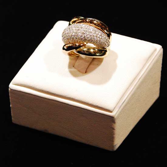 Featured is a ring finely crafted with 18K rose, yellow and white gold for a florid look. This ring is encrusted with sparkling loose diamonds for an enviable gleam. This ring, with style and volume, is sure to impress the crowd.