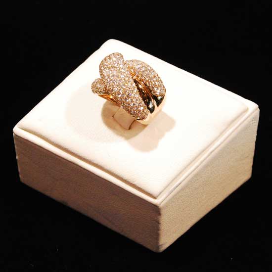 This pictured ring comes with a stylish intertwined design. The design is well interpreted with 18K rose gold and gleaming loose diamonds totaling 4.42 carats. The warm glow from the rose gold creates a great picture with the icy sparkles of the diamonds.