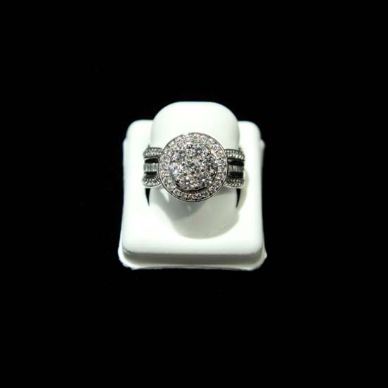 Highlighted is a diamond designed in a simple yet elegant style. The design features a three-row band and a round puffed adornment. Dazzling diamonds are set all over the ring to exhibit remarkable beauty.