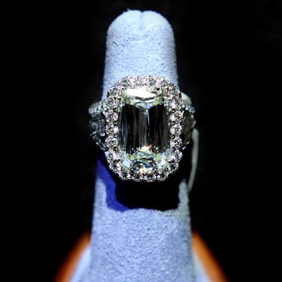 This photographed ring centers a diamond with an emerald cut. Surrounding it are smaller round diamonds that give dazzling sparkles. This exquisite creation of a ring makes a noble adornment on your hand.