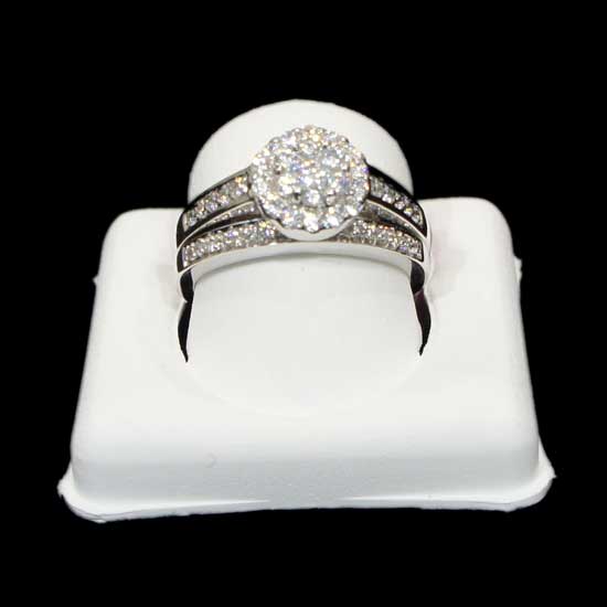 This dashing diamond ring features a 14K white gold setting. It is accented with a round diamond centerpiece surrounded with loose diamonds. This diamond ring matches evening dresses nicely.