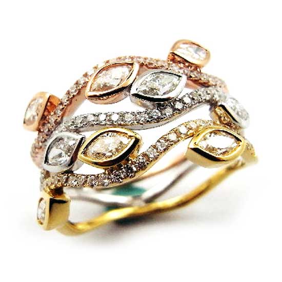 This diamond ring features three wavy bands in gold, silver and bronze tones. It is artfully crafted with olive-shaped adornments and sparkling diamonds for aristocratic grace. This diamond ring is sure to glam up your fingers.