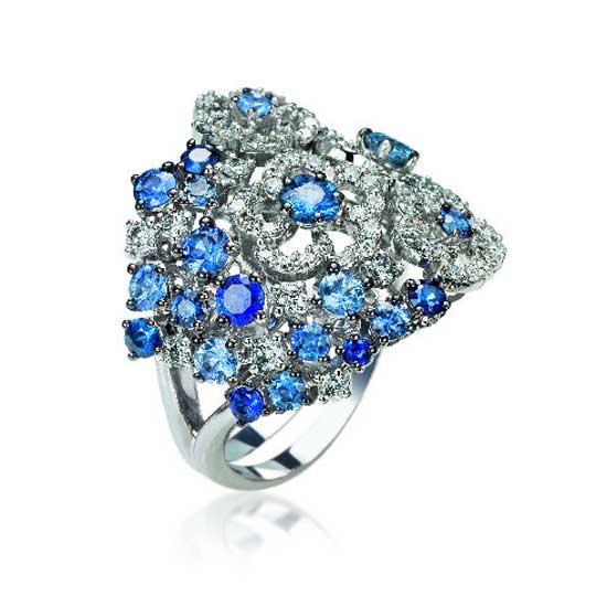 This showcased ring comes with a fashionable and luxurious design. It is finely crafted with stunning diamonds and blue sapphires on the white gold setting for added glamor. Add elegance and charm to your look with this diamond ring.