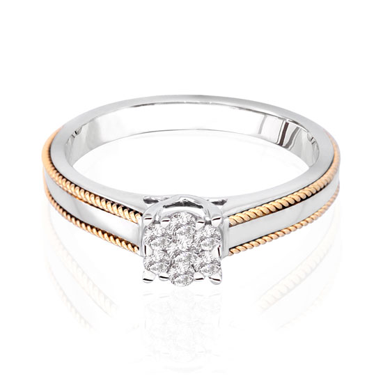 This dainty ring in a glossy silver hue features dazzling diamonds in the center. The golden-hued spiral details on the band add a spicy touch to the look. This sophisticated diamond ring is a great gift for your loved one.