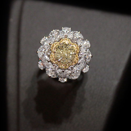 This finger ring comes with a gorgeous and luxurious design. It is crafted with dazzling yellow diamonds on the 18K white gold setting for an elegant touch. This stunning ring is finely made with great craftsmanship and delicate details for an attractive look.