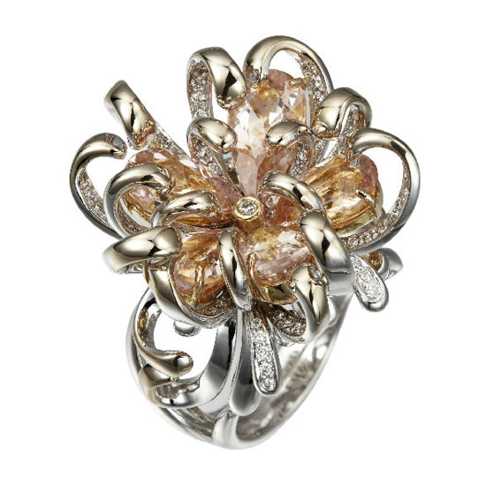 This is a stylish finger ring with a fashionable and gorgeous design. It is finely crafted with morganite stones and white diamonds on the 18K rose gold setting for an elegant touch. This well-designed ring is great for complementing your chic look.