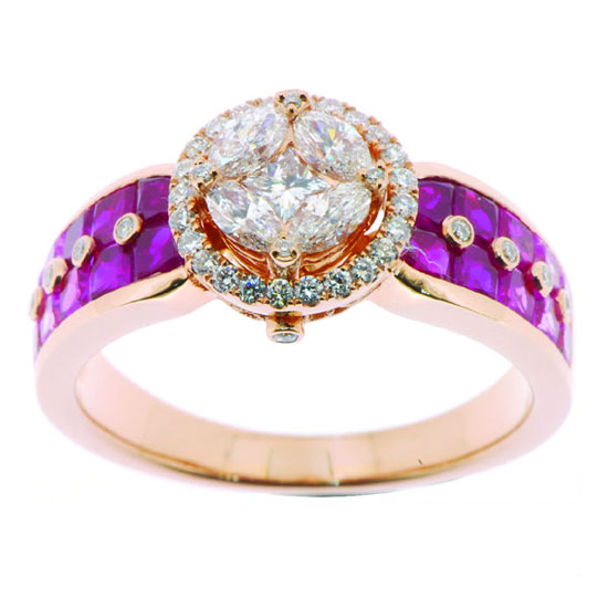 This is a diamond finger ring that comes with an elegant and luxurious look. The allover purple gemstones are well paved on the 18K pink gold. This high-end finger ring shimmers with a high-gloss finish.