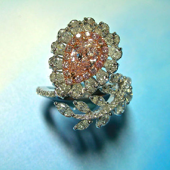This finger ring features precious fancy diamonds in a coral color with a pinkish hue. The white and fancy diamonds are inlaid in a pear-shaped mounting. The band resembles the shape of a tree branch, which is what makes this ring beautiful and unique.
