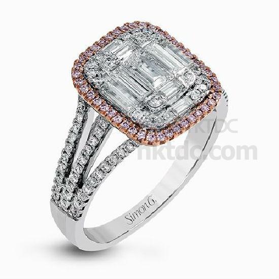 Featuring an eye-catching geometric setting, this white and rose gold contemporary ring is accented by .37 ctw round cut white diamonds with .10 ctw pink diamond and .53 ctw baguette cut diamond highlights.