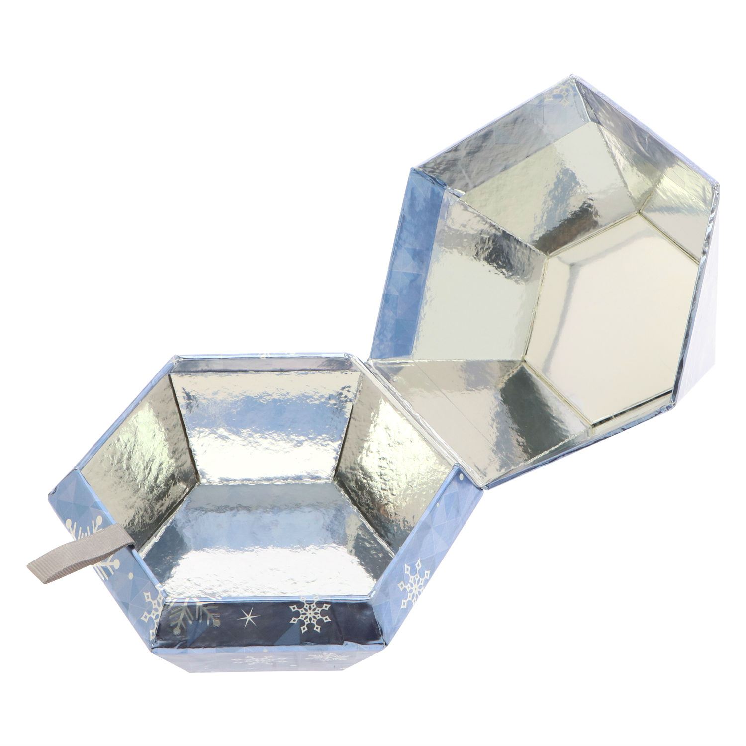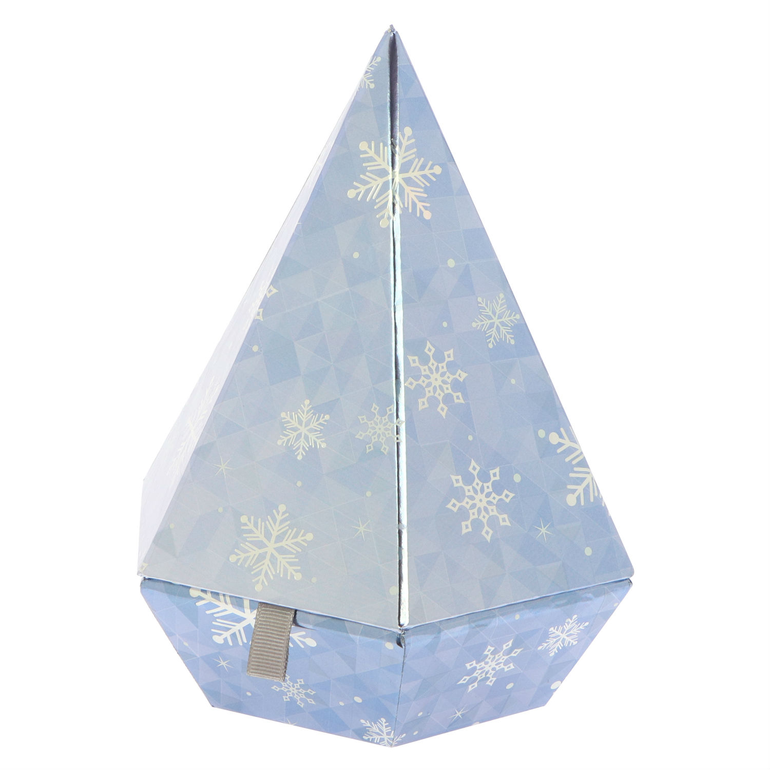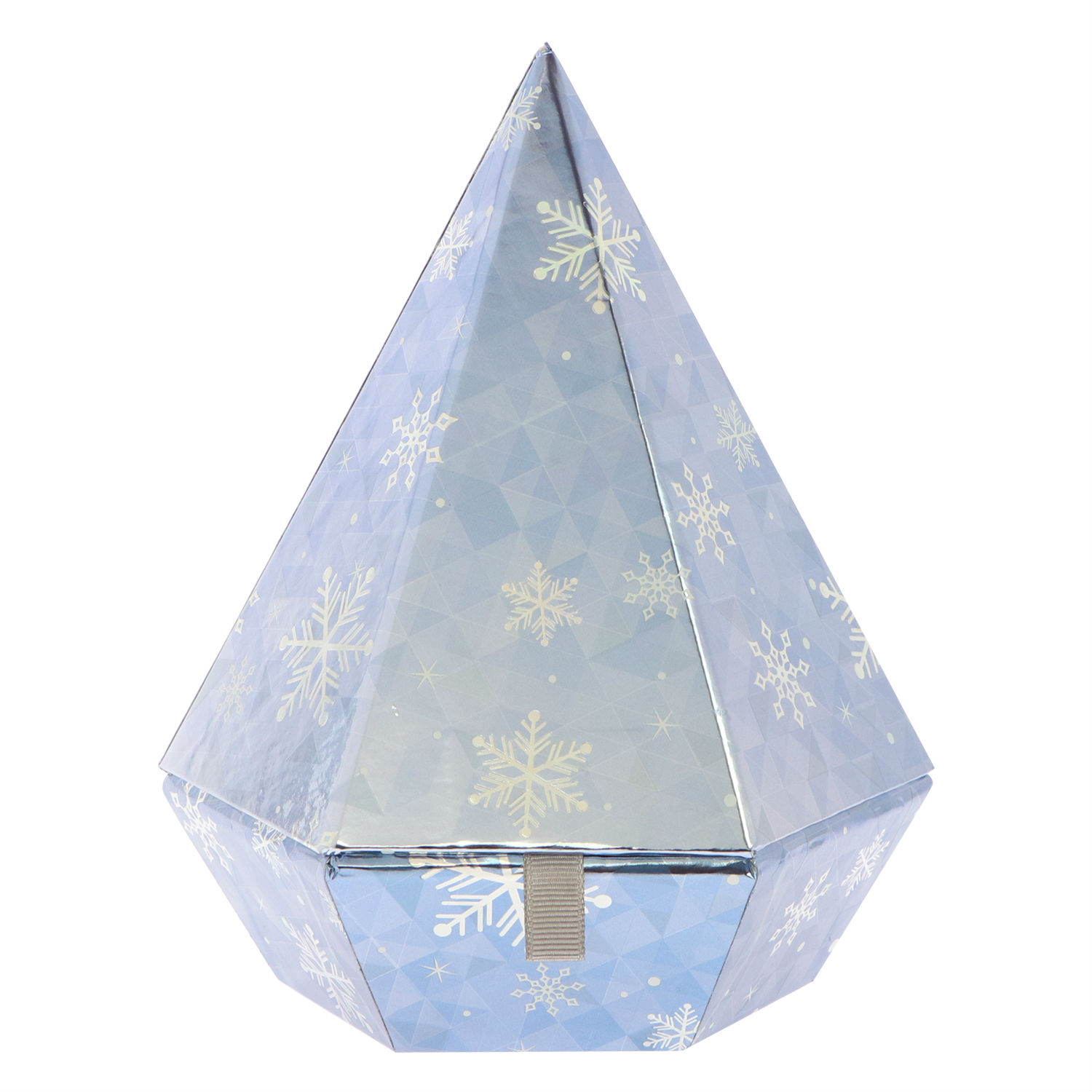- A rigid and durable diamond-shaped gift box printed with snowflakes.