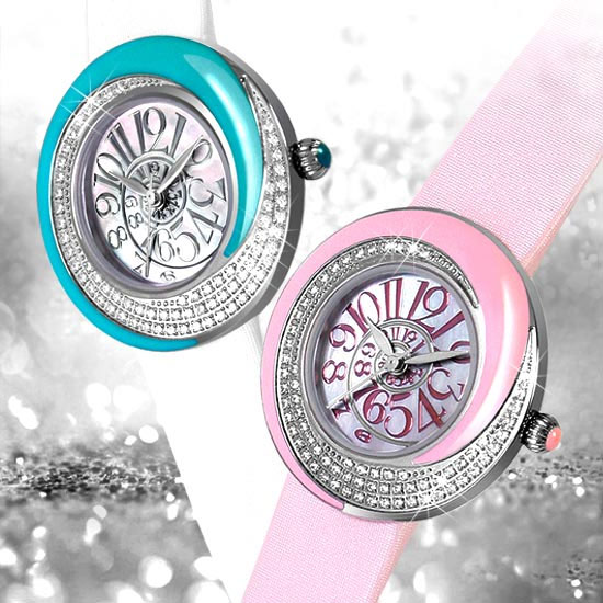 This ladies’ watch showcases a mother-of-pearl dial with Arabic numerals. The stainless steel case is accented with pastel color enamel and dazzling diamonds weighing 0.34 carats together. The design is completed with a genuine leather strap.