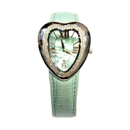 Pictured is an elegant watch displaying a heart-shaped case encrusted with diamonds. The Tiffany blue straps look feminine and stylish on any wrist. The watch certainly makes a fashionable timepiece for modern chic women.
