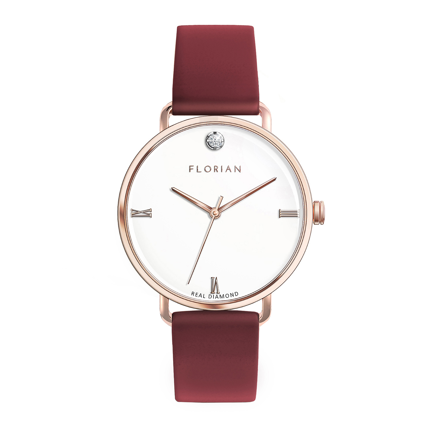 Tap for a chic dose of charm with this stunning wristwatch. Crafted to the finest with a keen eye on details, the delicate timepiece borders the diamond-accented dial with a sumptuously gorgeous fleur rose gold watch case. Paired up by a smooth cherry red watch strap, it promises to add exceptional classiness to your daily ensemble.