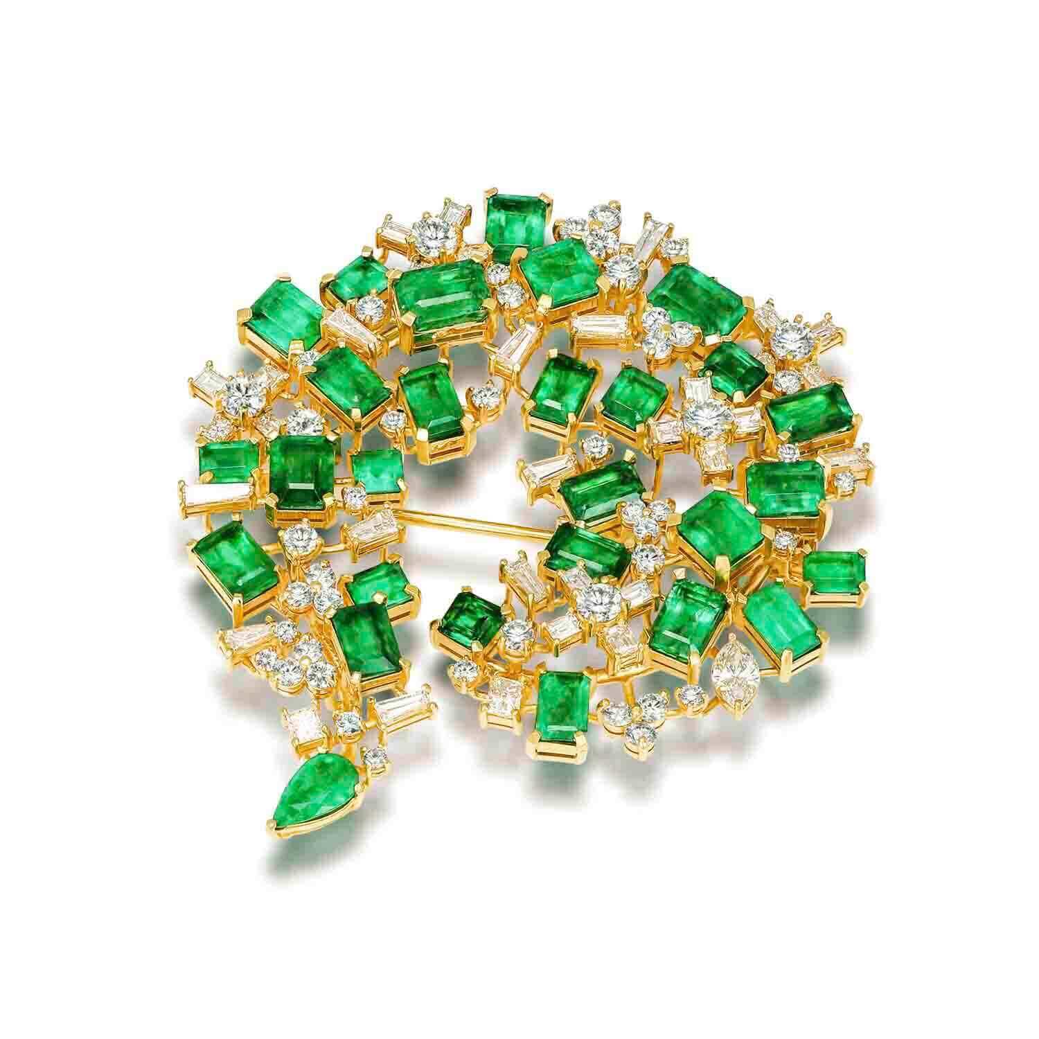 Natural Diamond & Emerald Brooch 18k Yellow Gold