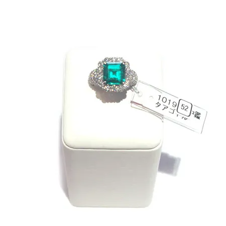 This diamond and emerald ring shines with a fusion of green and silvery glimmers. The princess-cut gemstone is encircled by a ring of diamonds for extraordinary charm. The exquisite ring with a splendid design will captivate everyone’s heart.