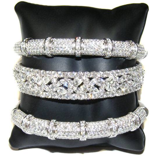These are ladies' bangles decorated with white diamonds of brilliant cut. The diamonds are available in various sizes and shapes.
